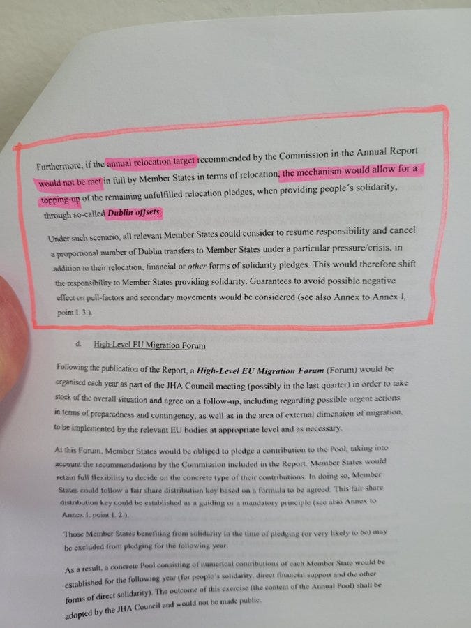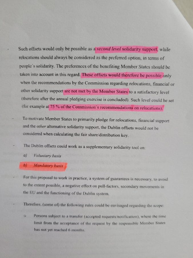 Na druhém a třetím skenu vidíte pasáže, kde se navrhuje mechanismus, který v paktu nakonec zůstal a bude fungovat jako povinné migrační kvóty. Je založen na převádění příslušnosti k vyřízení žádostí o azyl mezi členskými státy (v eurospeaku se toto nazývá dublinský offset). Zatímco v aktuální verzi paktu je minimální hranice kvóty 60 % z počtu relokací (offsetů) stanovených Radou EU, české předsednictví navrhovalo dokonce 75 % (třetí sken)