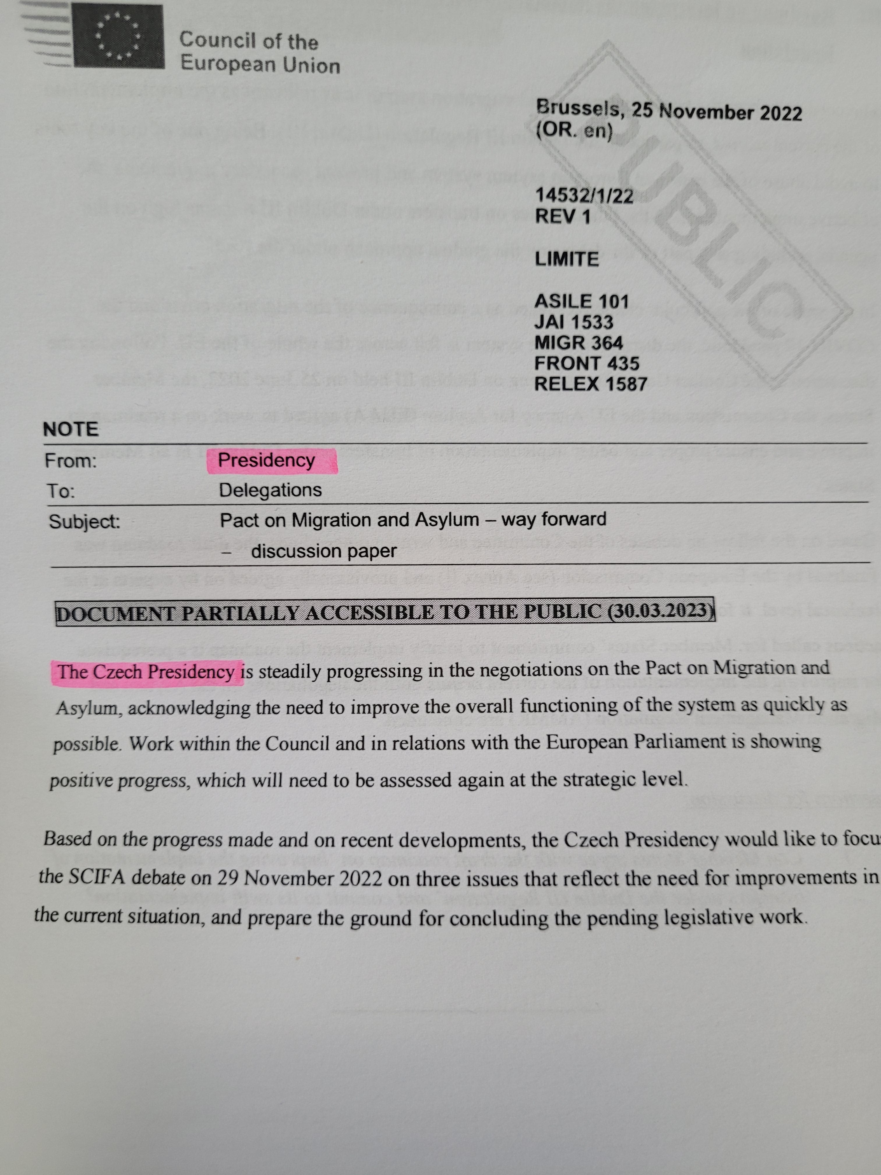 Klíčovým krokem v jednání o migračním paktu byl materiál “Cesta kupředu“ z 25.11.2022 předložený českým předsednictvím. Podstatná část dokumentu, který se podařilo navzdory utajení (viz první sken) získat Robertu Kotzianovi, obsahuje návrh základních principů migračního paktu.